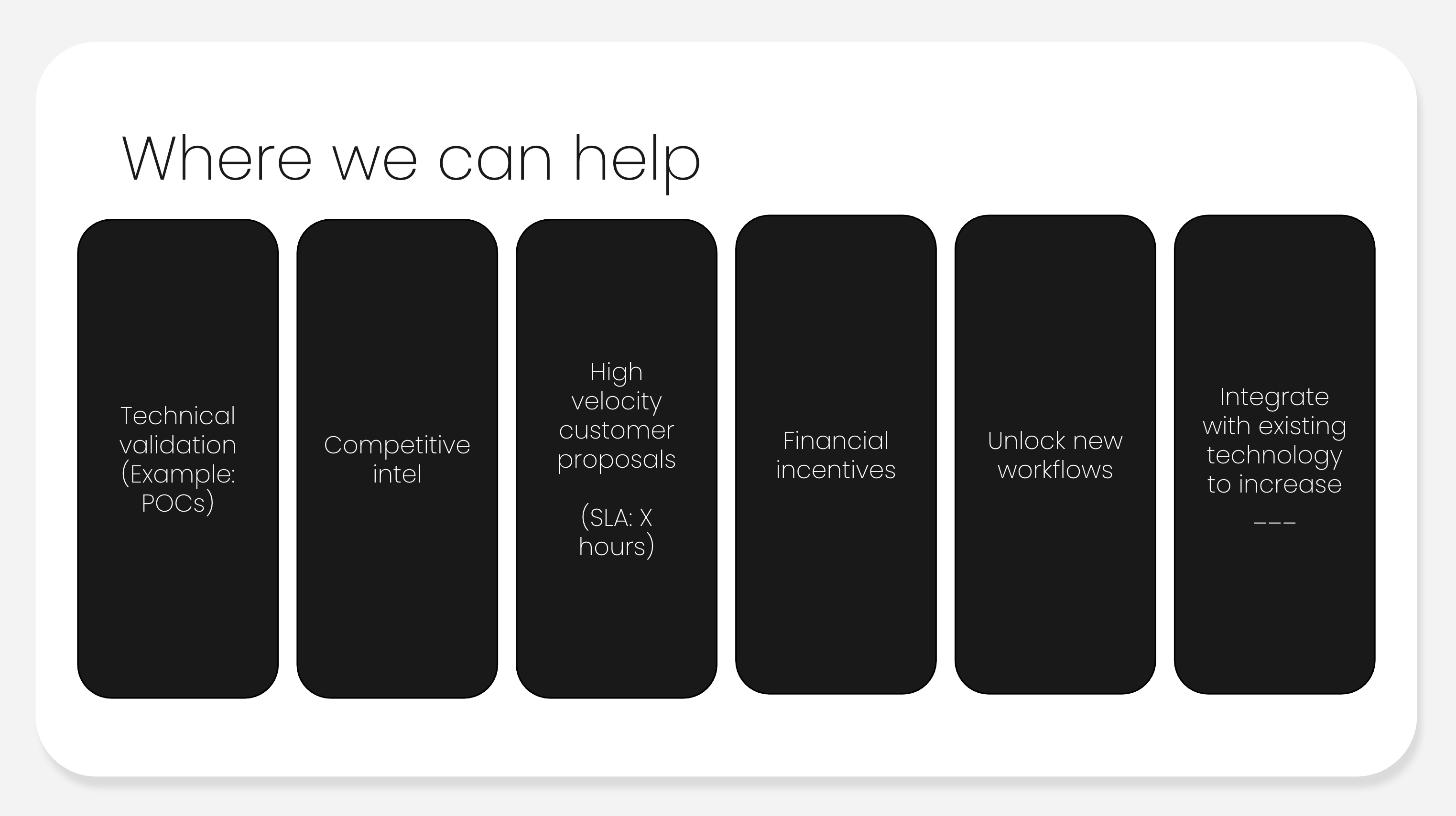 Our partners can do one discovery call and craft a customized proposal detailing the problem, solution and business outcomes + relevant customer case studies within 24 hours if it's a straightforward use case to help you win the deal. Here's an example of how we did this at (insert customer) with partner XYZ that led to a closed won opportunity in 10 days, 50% faster than our typical sales cycle!
